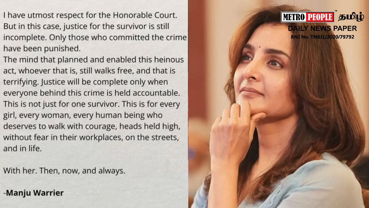 நன்றி, ஆனால், பாதிக்கப்பட்டவருக்கு நீதி இன்னும் முழுமையாக கிடைக்கவில்லை” என பாதிக்கப்பட்ட நடிகையின் கருத்தை ஆமோதிக்கும் விதமாக திலீப்பின் முன்னாள் மனைவி மஞ்சு வாரியர் சமூக வலைத்தளத்தில் பதிவிட்டுட்டுள்ளார்.